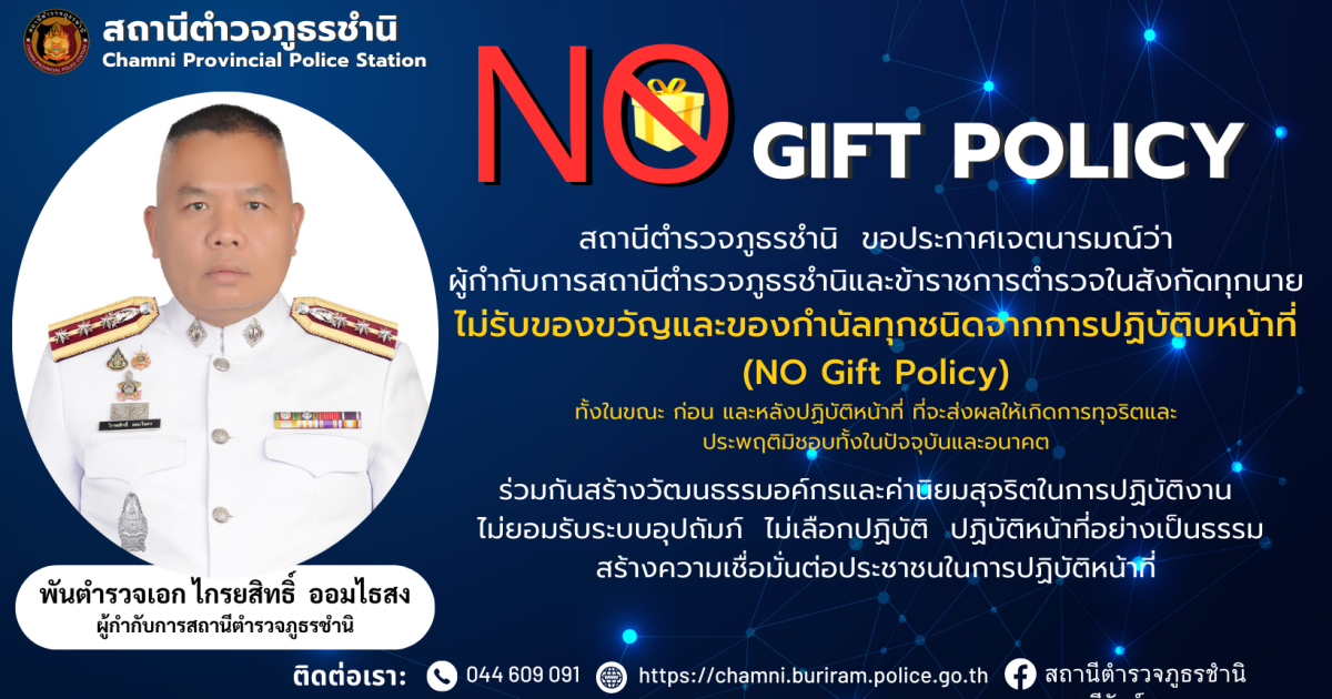 วันที่ 17 มีนาคม 2567 เวลา 08.00 น. พ.ต.อ.ไกรยสิทธิ์ ออมไธสง ผกก.สภ.ชำนิ ได้ประกาศนโยบายและมาตรการในการป้องกันการรับสินบนในงานที่เกี่ยวข้องกับด้านสืบสวน การสอบสวน และงานจราจร โดยบังคับเน้นย้ำ เจตนารมณ์ของหน่วยงานในการป้องกันและการต่อต้านการทุจริตของสถานีตำรวจภูธรชำนิ เจตนารมณ์ไม่รับของขวัญ และสินบนอื่นใด ทุกชนิดจากการปฏิบัติหน้าที่ของข้าราชการตำรวจทุกนาย