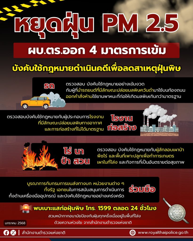 พล.ต.อ.กิตติ์รัฐ พันธุ์เพ็ชร์ ผบ.ตร. สั่งการตำรวจทุกหน่วยเพิ่มมาตรการเข้ม ตรวจสอบ และ บังคับใช้กฎหมายเพื่อลดสาเหตุการก่อฝุ่นละลองขนาดเล็ก PM 2.5 ซึ่งเป็นอันตรายต่อสุขภาพประชาชน