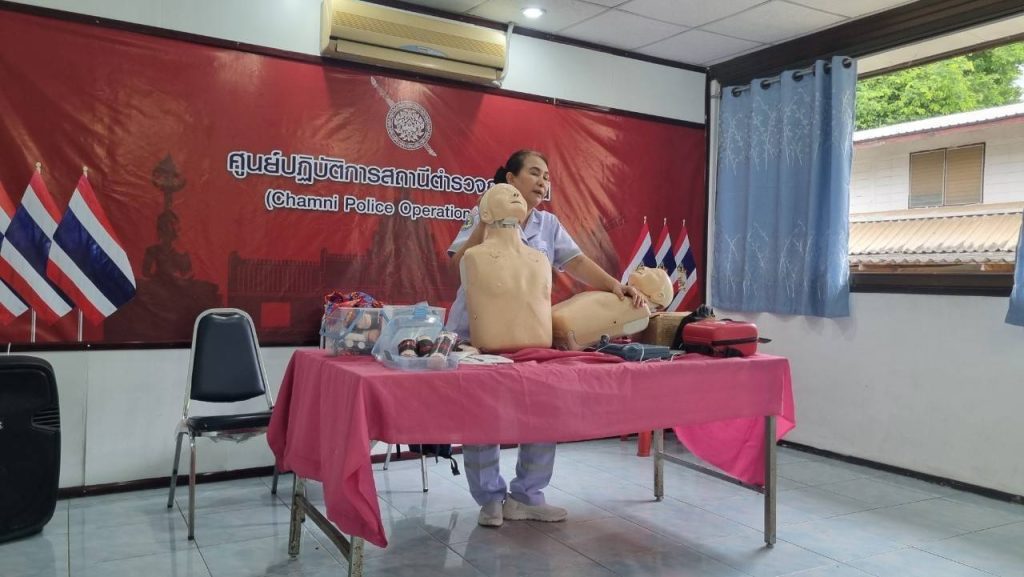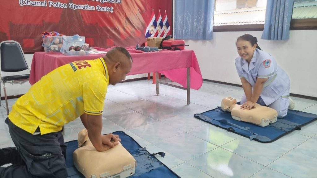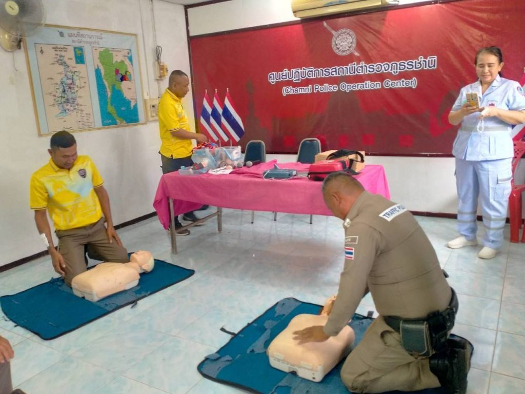 พ.ต.ท.ศศิศ เชิญรัมย์ รองผกก.ป.สภ.ชำนิ ดำเนินการฝึกอบรมตามโครงการฝึกอบรมเพิ่มประสิทธิภาพข้าราชการตำรวจ ประจำปีงบประมาณ พ.ศ. 2568 ณ ห้องประชุม สภ.ชำนิ โดยมี ผู้เข้ารับการฝึกอบรมประกอบด้วย ข้าราชการตำรวจ สายงานป้องกันปราบปราม สายงานจราจร สายงานสืบสวน สภ.ชำนิ จำนวน 25 นาย ทั้งนี้ได้รับการสนับสนุน คณะวิทยากรจากโรงพยาบาลชำนิ จังหวัดบุรีรัมย์ เพื่อบรรยายให้ความรู้ เกี่ยวกับการปฐมพยาบาลเบื้องต้น การช่วยเหลือผู้ป่วยฉุกเฉิน(CPR)การใช้เครื่องกระตุกไฟฟ้าหัวใจอัตโนมัติ(AED) และการปฏิบัติกรณีคลอดฉุกเฉิน