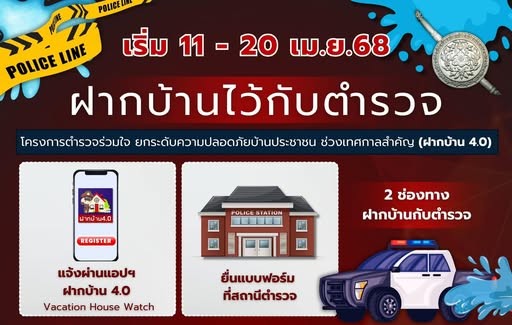 สงกรานต์ 2568 ฝากบ้านไว้กับตำรวจ เริ่ม 11 – 20 เมษายน 2568ผ่าน 2 ช่องทางฝากบ้าน