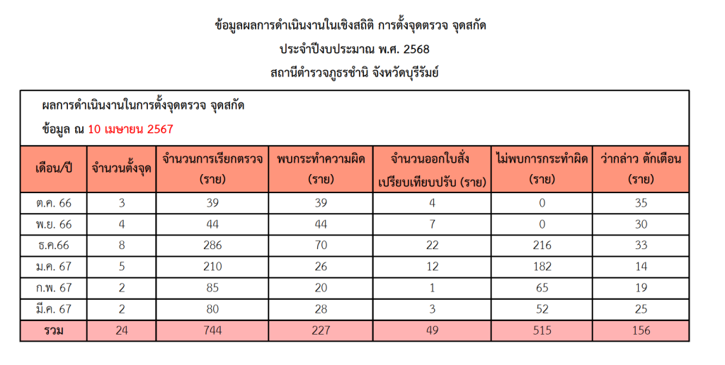 สถิติการตั้งจุดตรวจ จุดสกัด 6 เดือนแรก(ต.ค.67-มี.ค.68) ของ สภ.ชำนิ จว.บุรีรัมย์